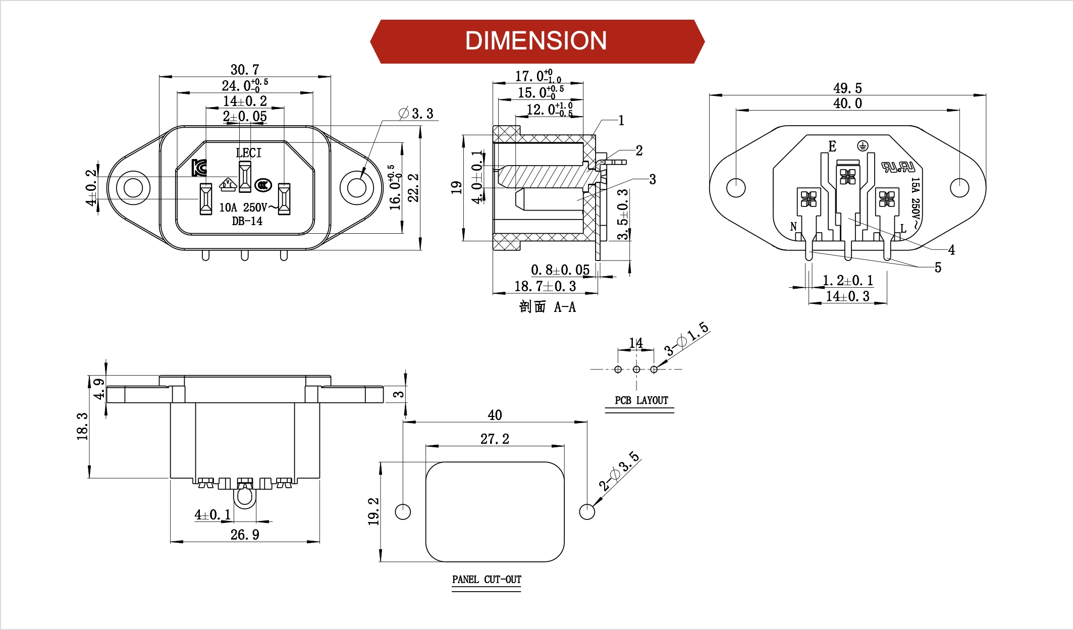 端子塑膠之間3750VAC (50-60Hz) 1 min