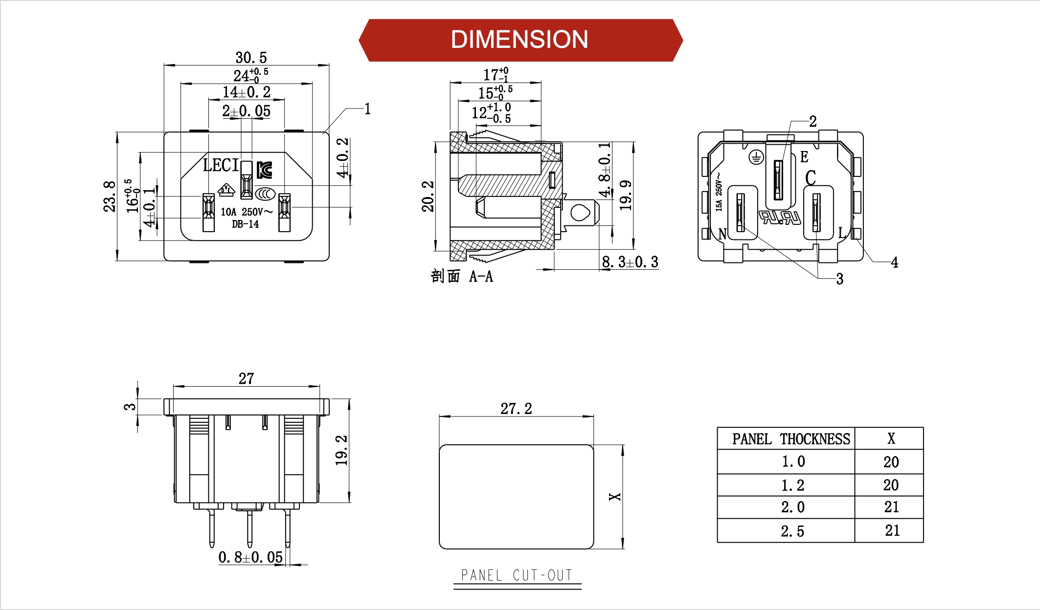 端子塑膠之間3750VAC (50-60Hz) 1 min