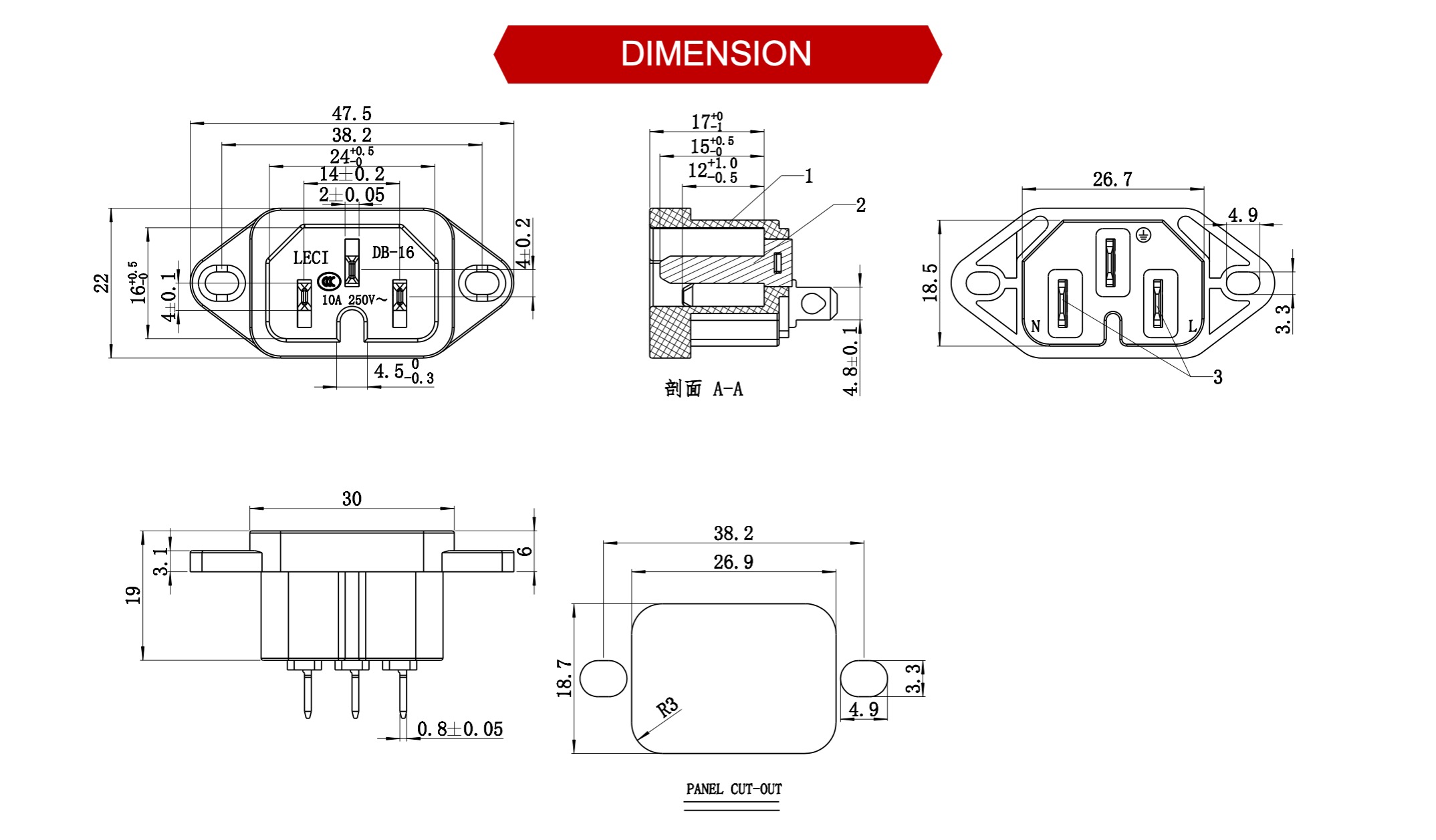 端子塑胶之间3750VAC (50-60Hz) 1 min