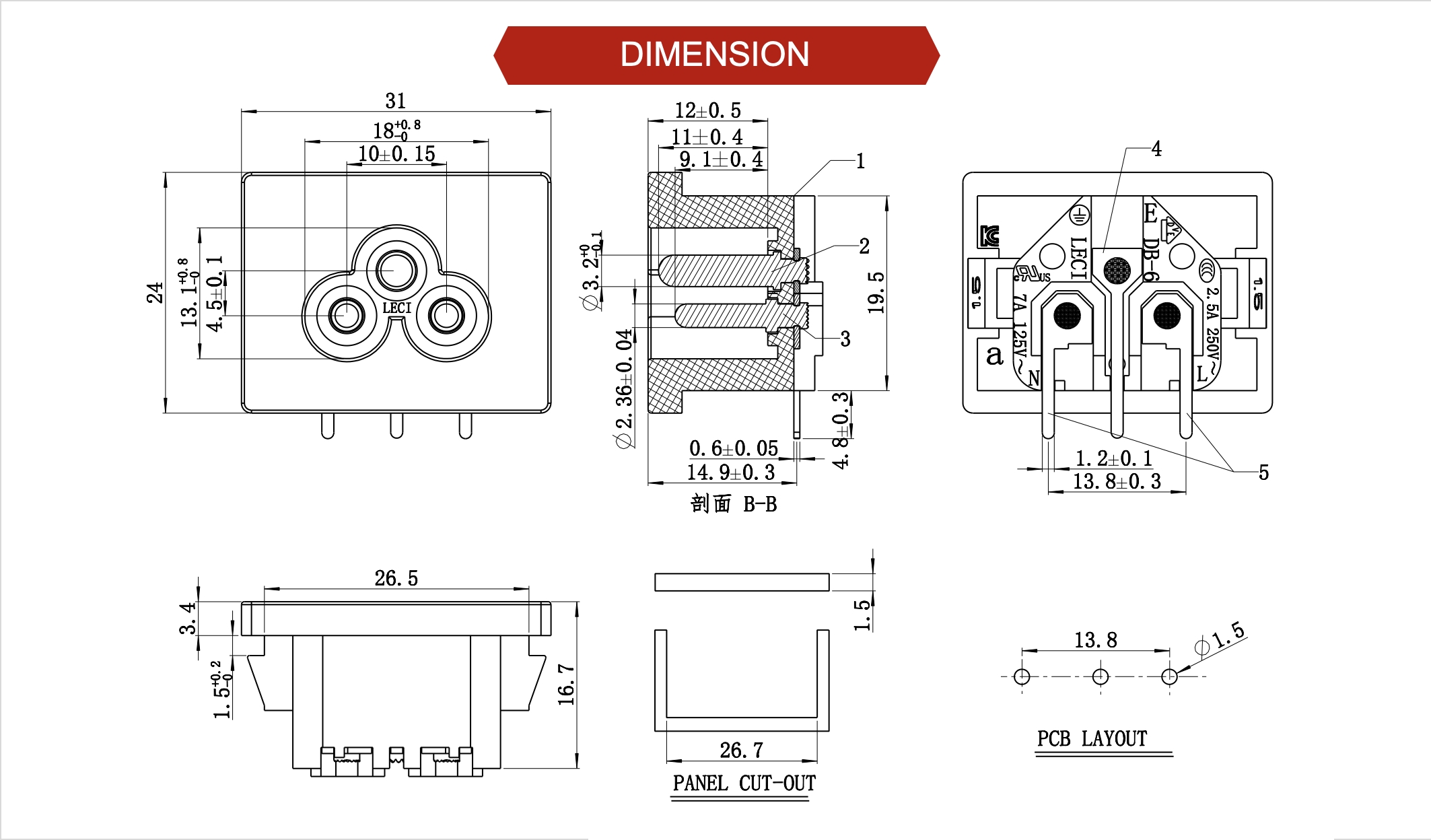 端子塑膠之間3750VAC (50-60Hz) 1 min