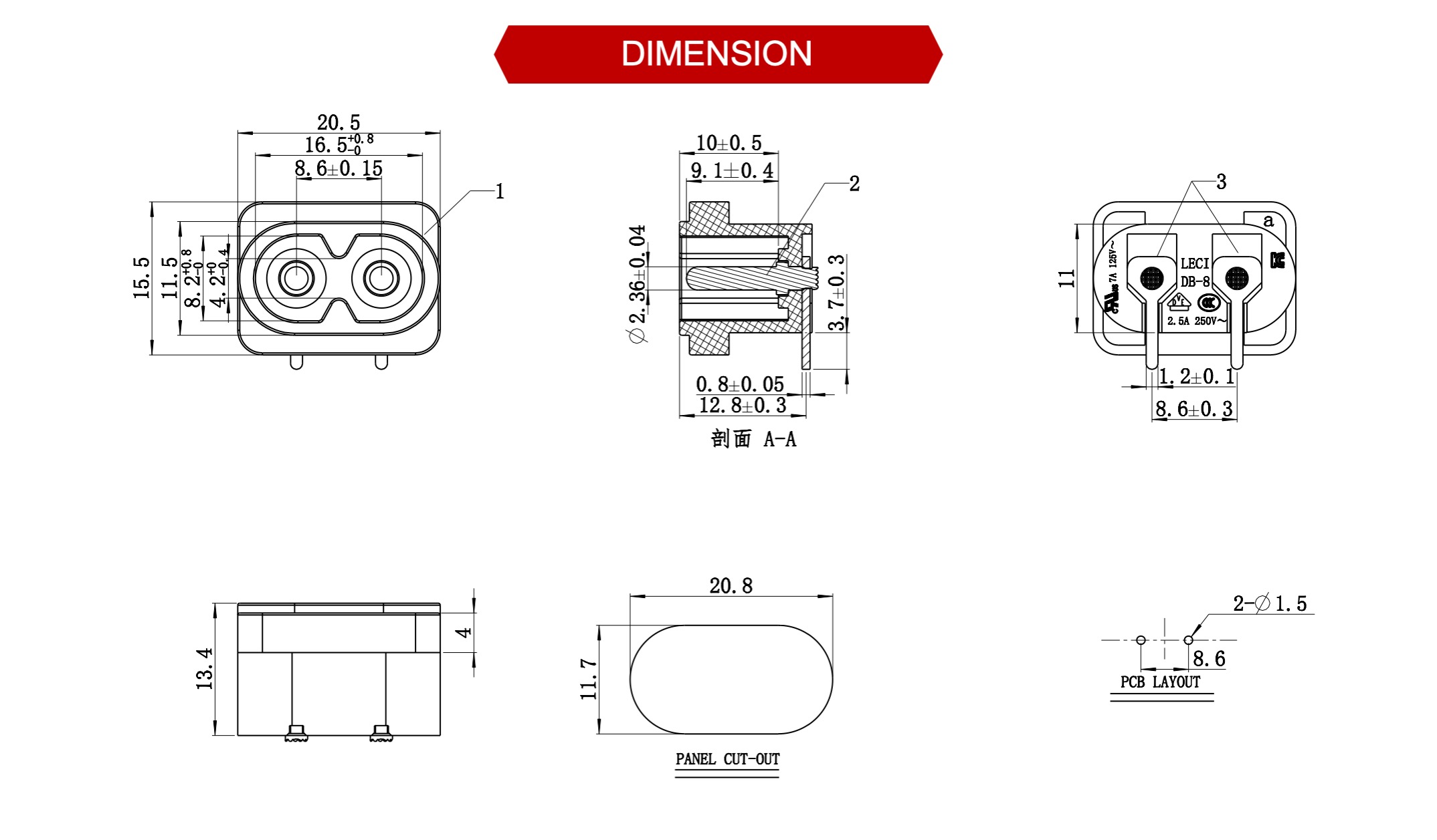 端子塑膠之間3750VAC (50-60Hz) 1 min